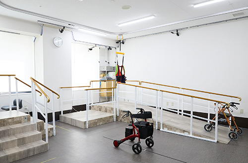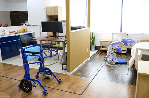 室内スペース(寝室、リビング、台所、トイレ、浴室等)と屋外スペース(階段、スロープ、悪路等)を模した空間で、日常生活を再現することができます。また、アシスト技術・ロボットを対象者の目的に応じて試すことができます。安全性に十分配慮しながらモビリティ支援やバランス機能の評価など、実証研究を進めています。